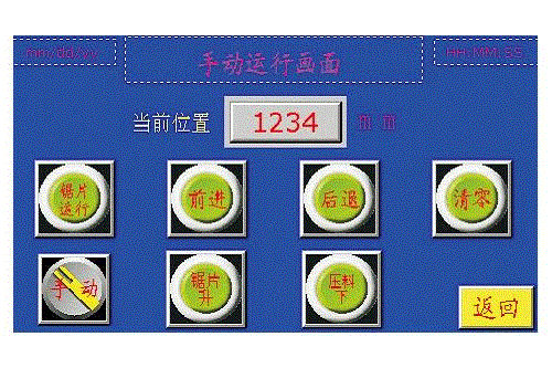 人机画面程序手动画面如图4:显示当前锯片位置,可以动控制压料气缸,锯片运行,锯片升降气缸,锯片前进、后退等等工艺动作。