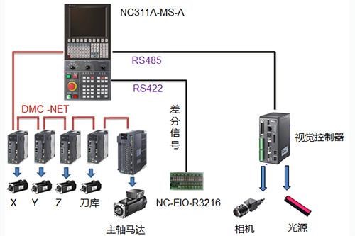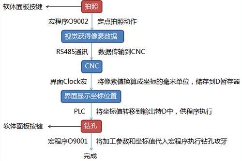 在使用导入了台达综合解决方案的数控钻铣中心之前,该客户的终端用户进行模具导流槽工件的加工,主要由手动机械进行钻孔和挖槽,速度慢且人工成本高。因此,该终端客户寻求用数控加工设备来替代人工,同时要求钻孔位置精度要达到1mm以内。根据客户及终端用户的需求,台达通过整合自有CNC控制器、交流伺服系统ASDA-A2系列、CNC专用伺服及配套主轴、机器视觉等工业自动化产品,提供了CNC+机器视觉综合解决方案,可充分满足设备的智能自动化加工以及伺服刀库等应用需求。台达综合解决方案架构和控制原理如图1、图2所示: