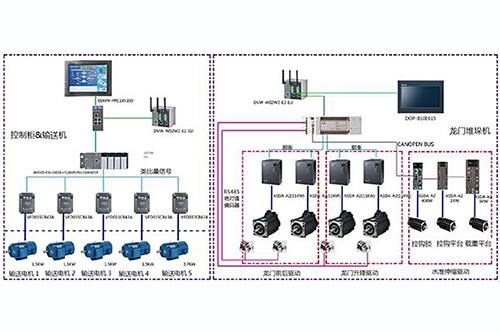 台达提供的智能立体仓库控制系统解决方案,由台达DIAView SCADA工业组态软件、工业无线路由器、模块化中型PLC AH500系列、高彩人机界面DOP-B系列、高功能型交流伺服系统ASDA-A2系列、工业平板电脑、变频器等工业自动化产品组成,主要应用在控制柜、输送机、龙门堆垛机三个关键工序,方案组织架构如图一: