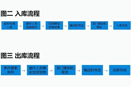 入库时,客户铝材经过包装处理后,开始进入入库程序,操作人员在DIAView主页面(如图四所示)进行库位选择,再通过扫描条形码获取货物信息;由DIAView将货物信息连同库位等入库信息一起写入库存资料库,然后货物通过输送机送上龙门堆垛机,再由龙门堆垛机将货物放入所选库位,完成入库程序。入库流程如图二: