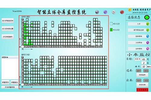 在系统主画面中,红线方框内为客户立体仓库整体情况显示,每一个黑色方框代表一个库位;显示绿色表示该库位有货物放入,绿色填充比例表示该库位的实时占用情况。画面左上为手动操作按键,包括输送机和龙门堆垛机的手动操作控制,右侧为货物出入库操作按键、出入库信息及库存信息查询按键、龙门堆垛机的自动运行状况监控等。