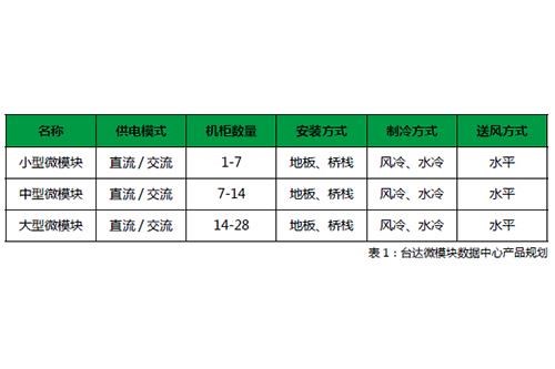 台达微模块数据中心产品的颜色一般为黑色、哑光,机房灯光下无晕眩感。包含:市电配电柜、UPS+列头、电池柜、网络机柜、机柜式(列间)空调、通道封闭组件、动环监控、门禁、视频监控、底座及内布线桥架等(见表1)。台达微模块数据中心产品优势包括: