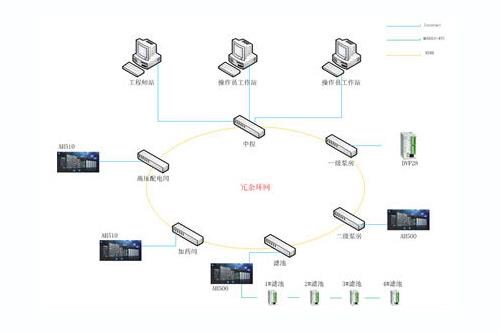 该水厂生产系统的控制方案采用了台达提供的设计方案,包括3套AH500-EN、1套AH510-EN、6套28SV+EN01以及台达的7寸和10寸的人机界面、二泵房6台CP2000变频器(90kw+160kw)。整个系统拓扑图(主干网采用光纤环网)如图1所示。