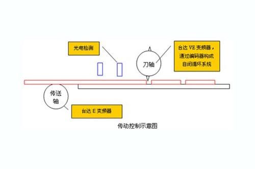通过对设备控制要求的分析,这是比较典型的飞剪裁切功能应用,而台达20PM已内置飞剪功能,可采用以DVP-20PM为控制核心的台达整体解决方案完成对切刀控制,实现设备控制要求,传动控制示意图如图3