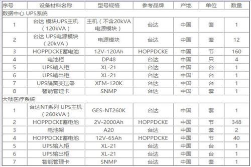 根据负载功率初步统计情况,UPS按如下功率需求进行配置:机房配置模块化120kVA UPS 1台,后备时间1h;大楼ICU、呼吸机、手术室等系统,配置260kVA以上UPS 1台,后备时间4h;要求UPS具有:高可靠性、高可用性、环保节能。